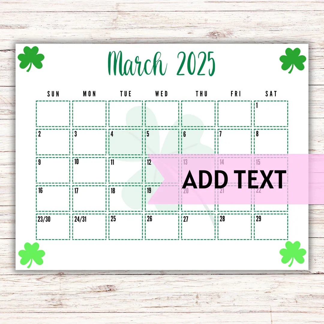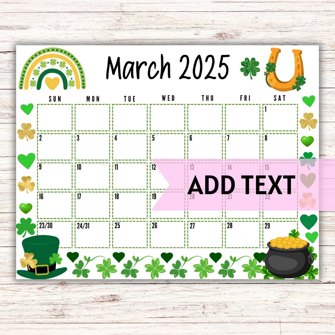 EDITABLE Printable March 2025 Calendar St Patrick s Day Themed Calendar Classroom Calendar Fillable Calendar Homeschool Planner Etsy