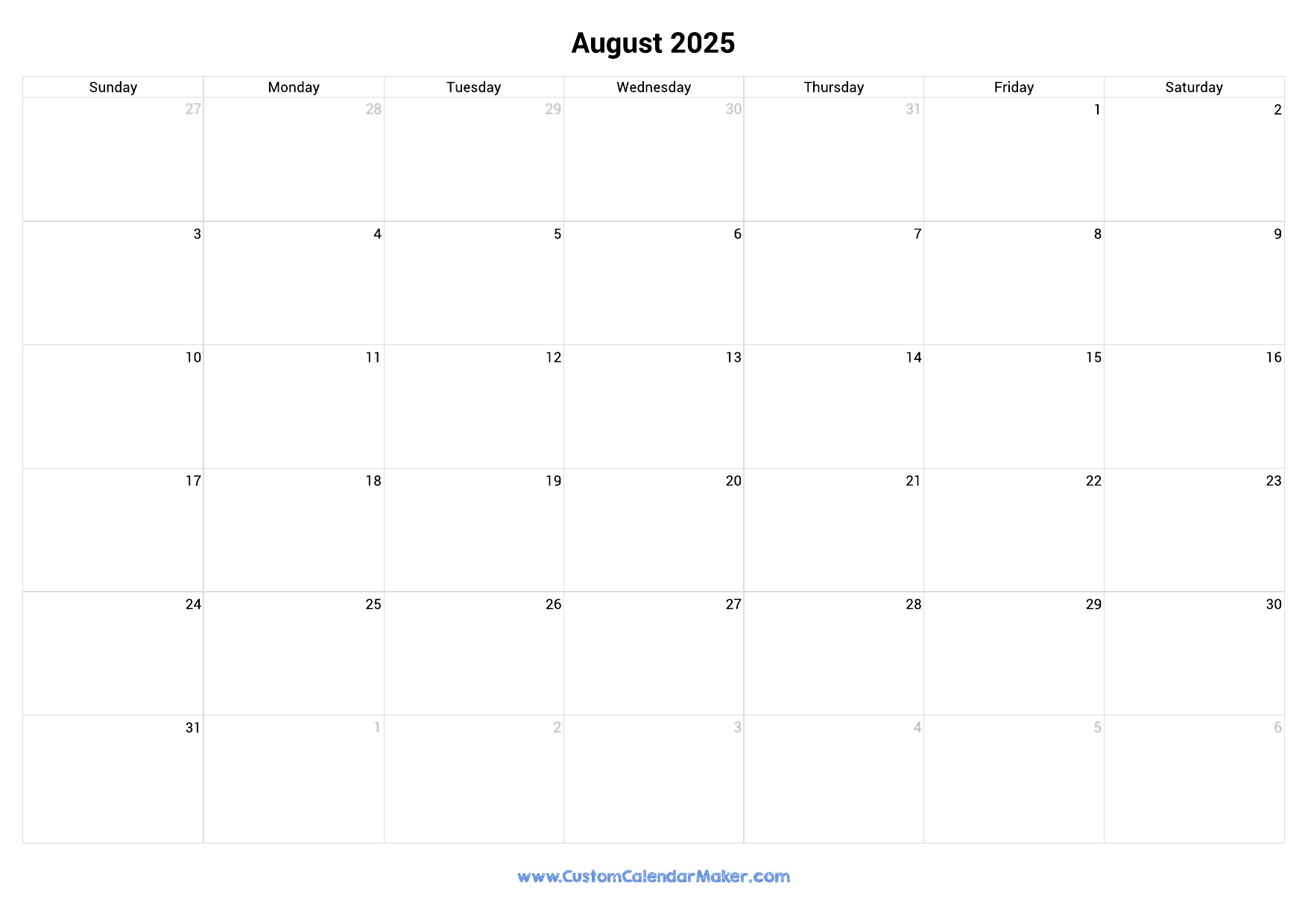 August 2025 Landscape Calendar With Large Boxes Custom Calendar Maker