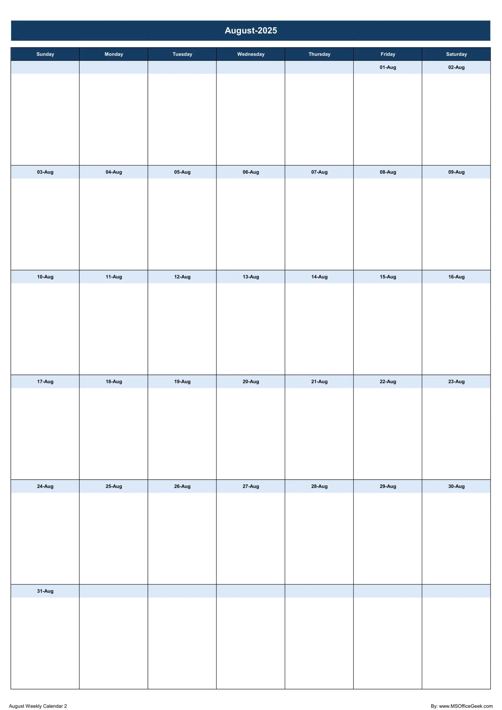 Get organized, stay on top of your schedule, and make the most of your time with our August blank calendar for 2025. Download it now and start planning for a successful and productive month ahead!