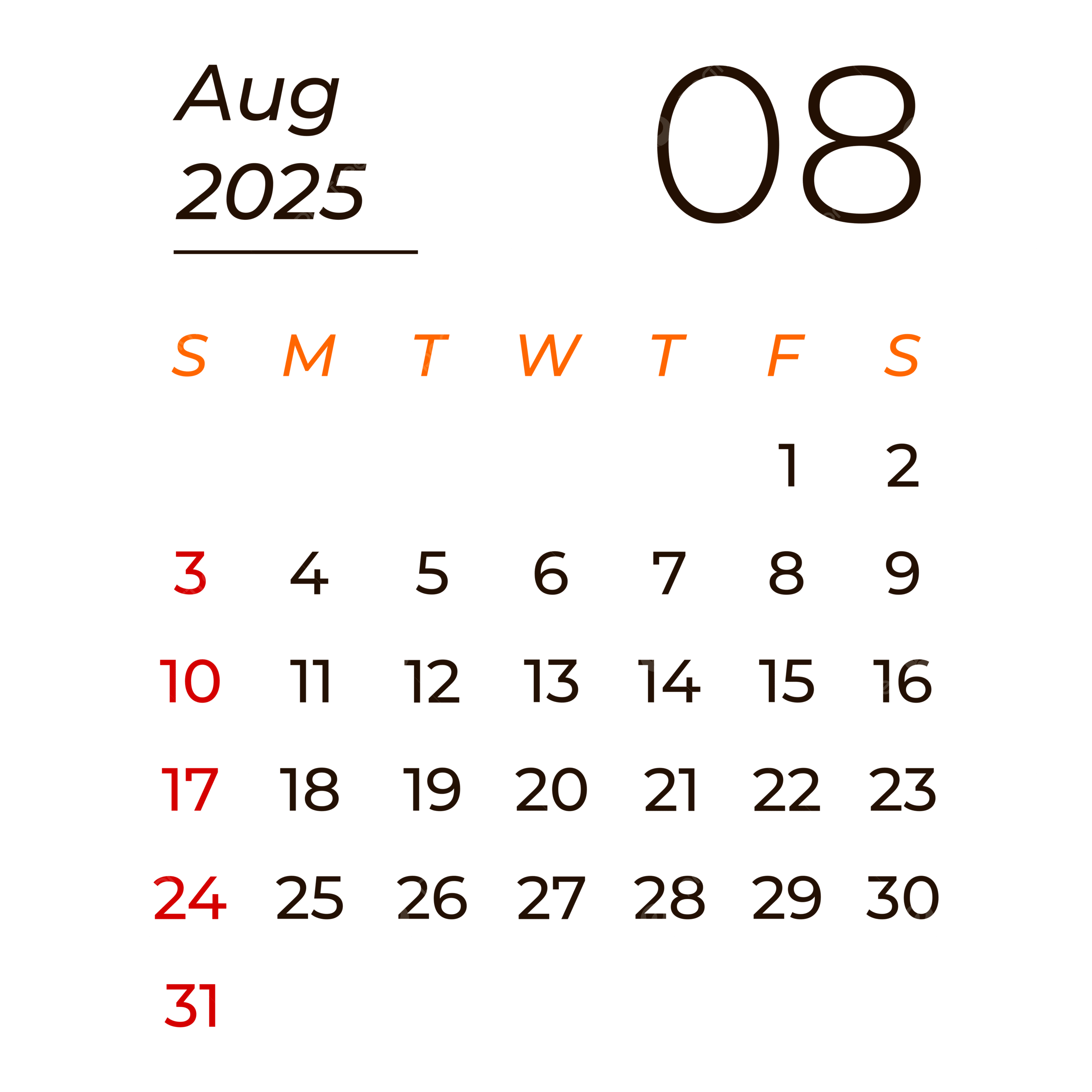 Calendar August 2025 Vector August 2025 Calendar 2025 Calendar August PNG And Vector With Transparent Background For Free Download