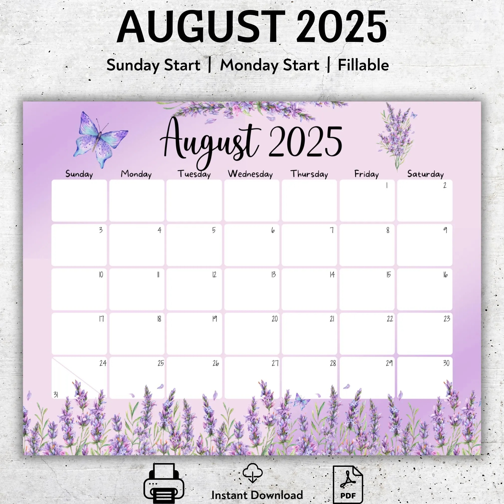 EDITABLE August 2025 Calendar Beautiful Butterfly And Lavender Printable Vacation Planner August Monthly Schedule Instant Download Etsy