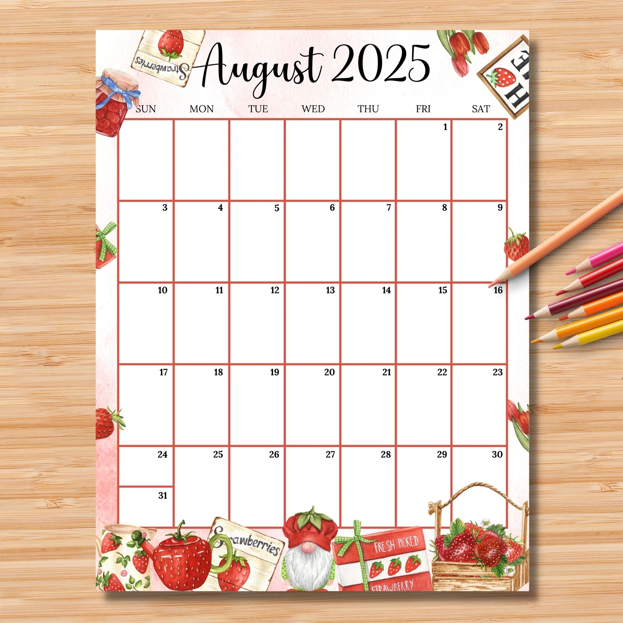 EDITABLE August 2025 Calendar vertical portrait Sweet Summer W Strawberry Gnome Monthly Schedule For Kids School Home Work Office Etsy