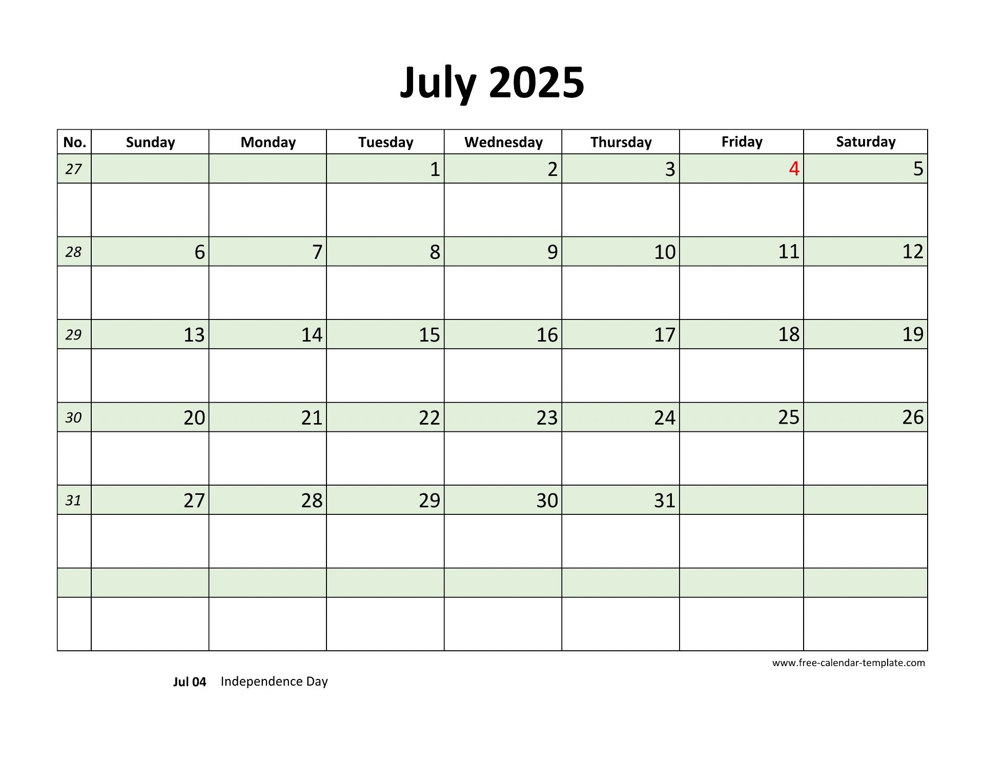 Free July 2025 Calendar Coloring On Each Day horizontal Free calendar template