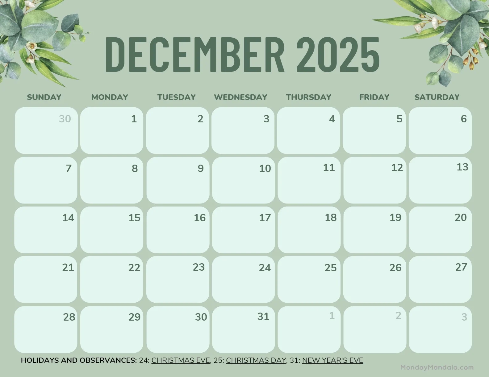 December 2025 Calendar With Extra large Dates WikiDates
