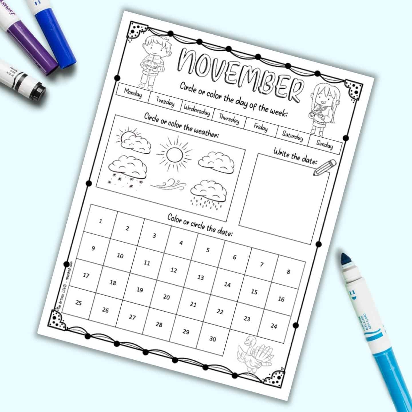 Free Printable November Calendar Worksheet For Kids The Artisan Life