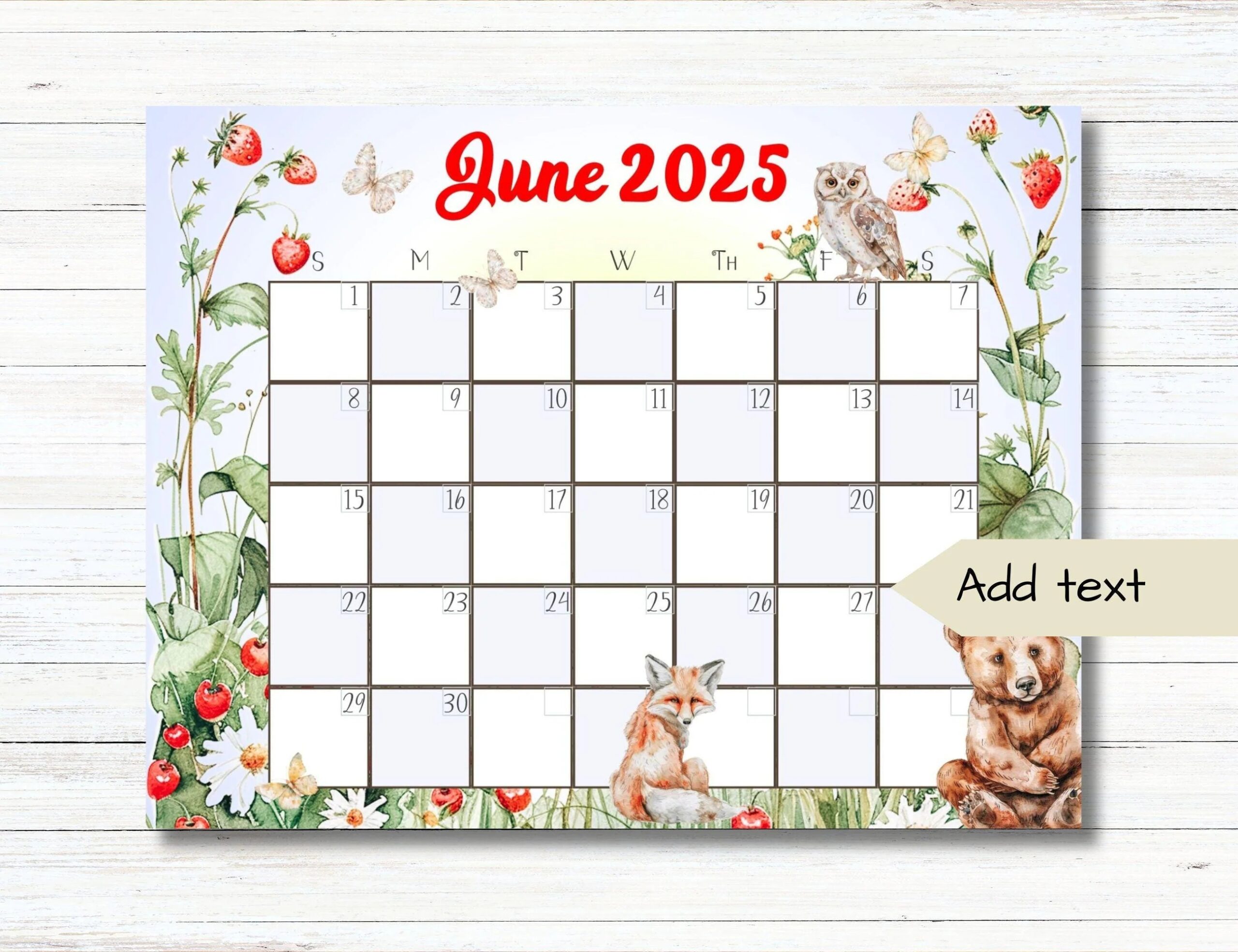EDITABLE June 2025 Calendar Woodland Calendar Forest Animals Strawberries Fillable Printable Monthly Calendar School Planner Digital Etsy