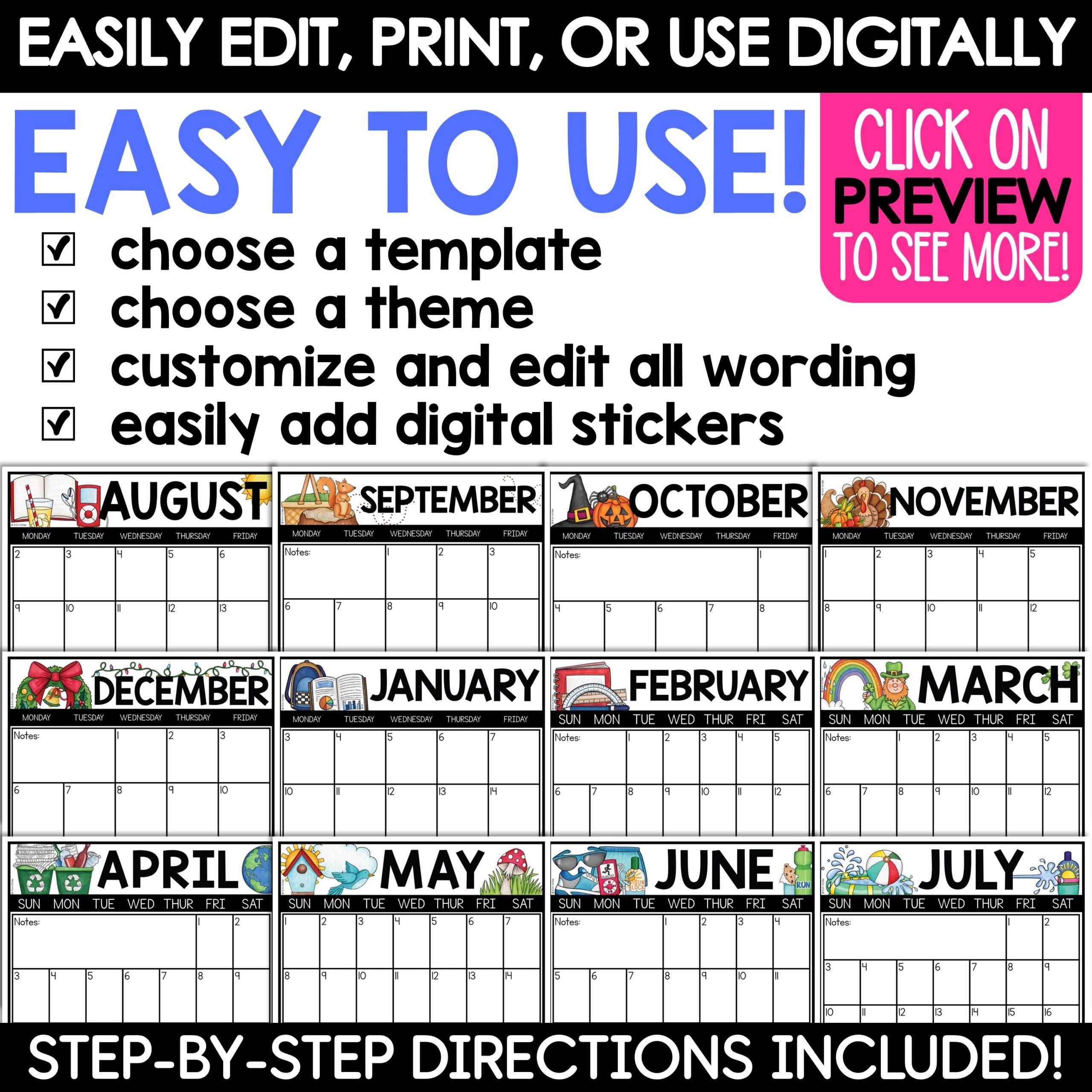 2025 2026 Editable Monthly Calendar Templates Digital Planner Stickers With Free Updates A Love Of Teaching Kim Miller