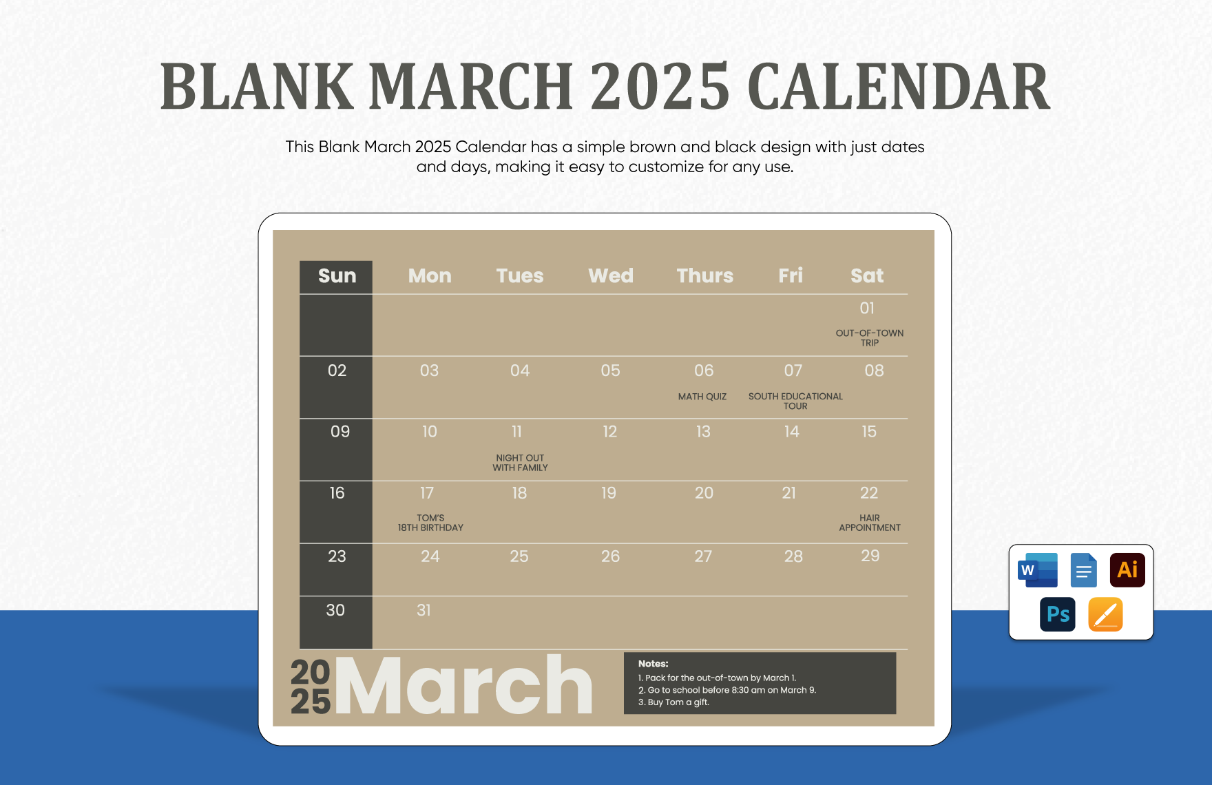 Blank March 2025 Calendar Template In PSD Word Illustrator Apple Pages Google Docs To Download Template