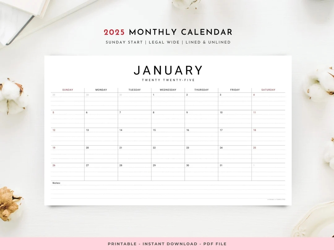 2025 Monthly Yearly Printable Wall Calendar Horizontal Legal Size 8 5 X 14 Sunday Start Lined And Unlined Simple Minimalist Design Etsy