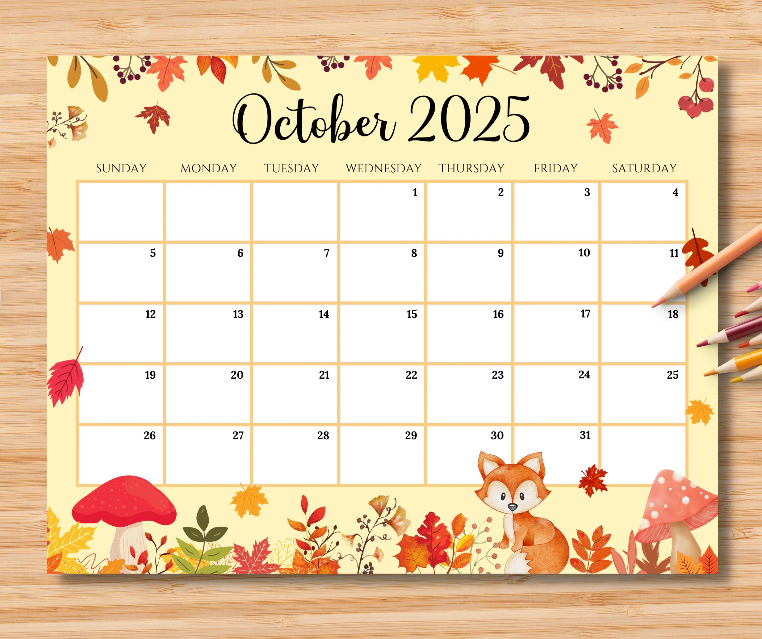 EDITABLE October 2025 Calendar Beautiful Autumn W Cute Little Fox Planner Printable Monthly Calendar For Kids School Home Work Office Etsy