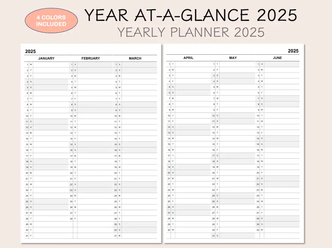 Printable Yearly Planner Calendar 2025 Yearly Overview 2025 Year At a glance 2025 4 Colors Etsy