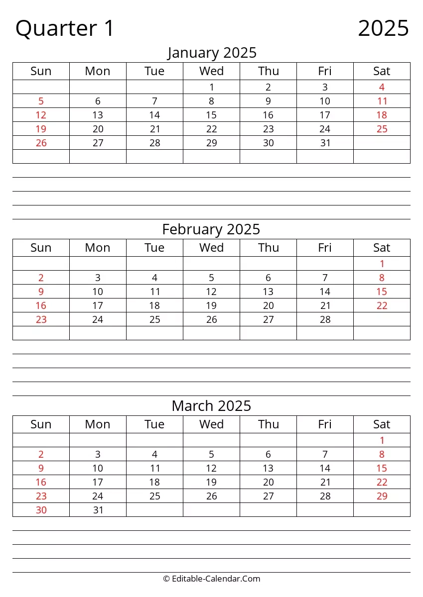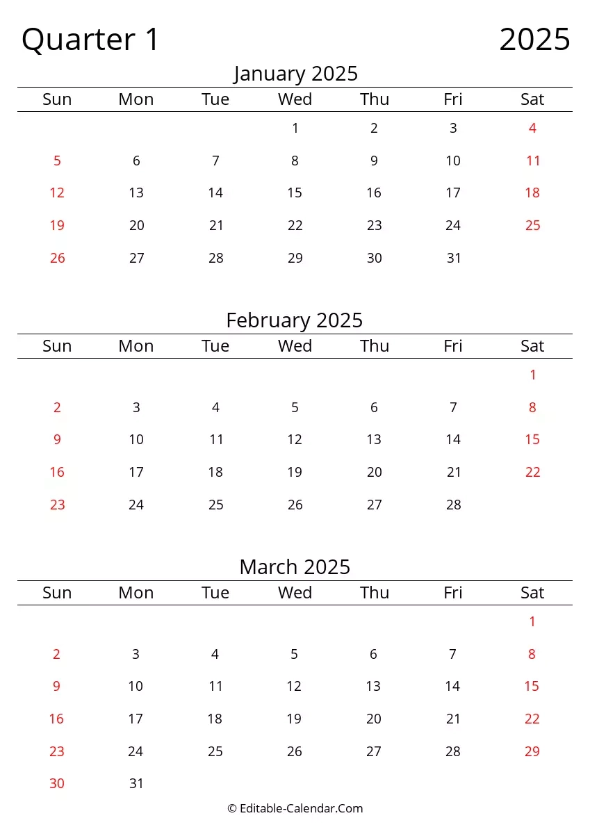 Quarter 1 Of 2025 Editable Calendar In Excel Word PDF