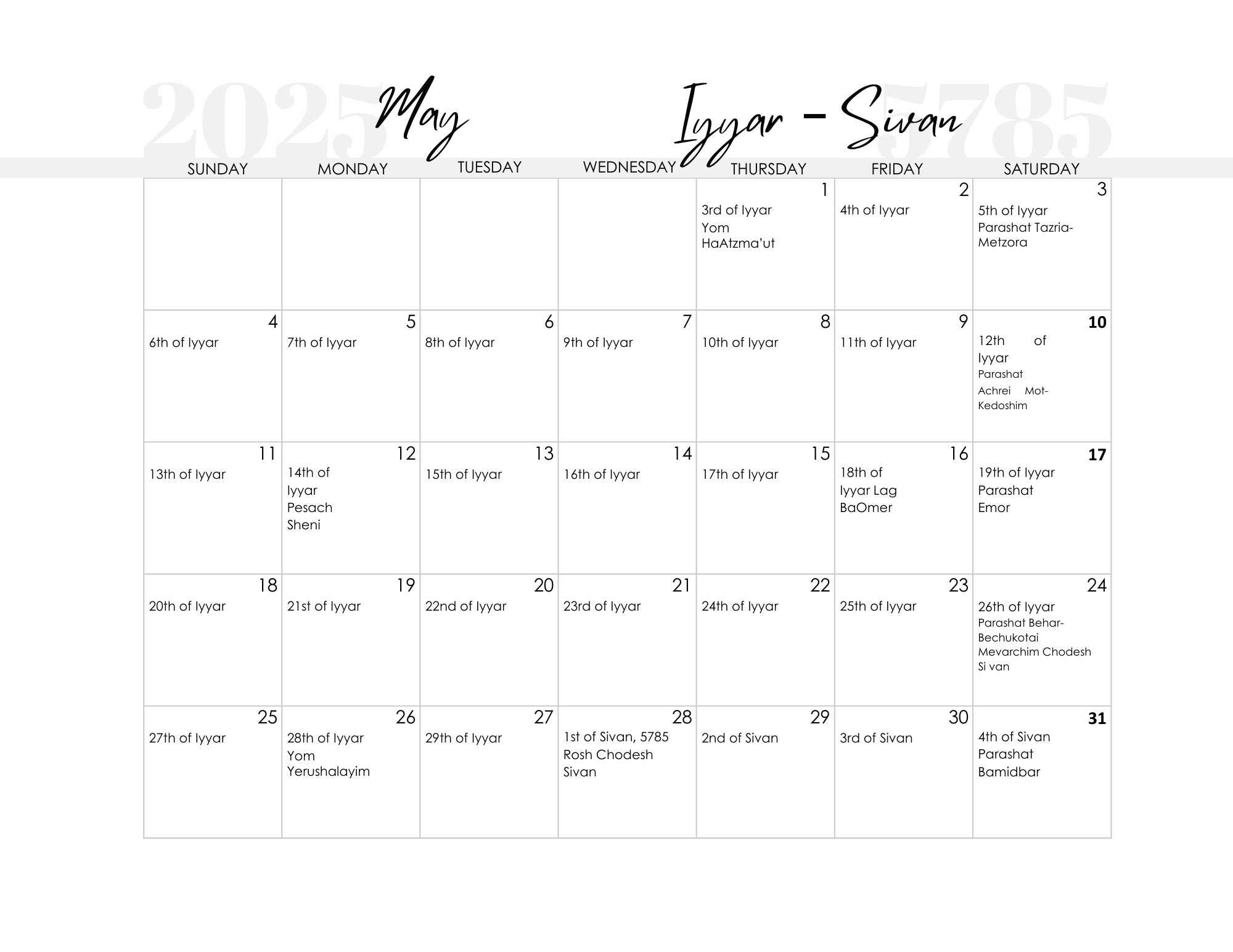 FREE Printable Jewish Calendar 2024 And 2025