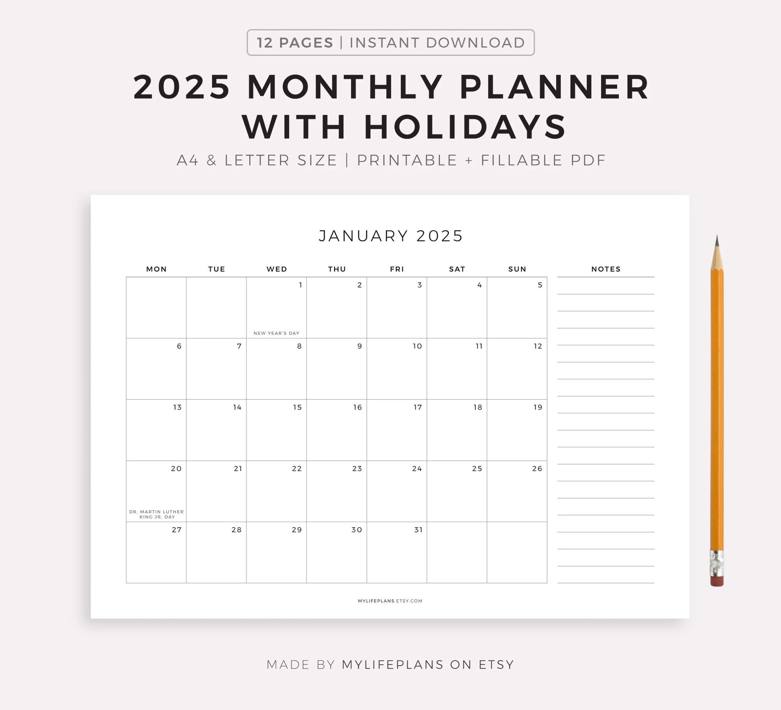 2025 Monthly Planner With Holidays Monthly Organizer Month At A Glance 2025 Calendar A4 letter Landscape Printable Fillable PDF Etsy