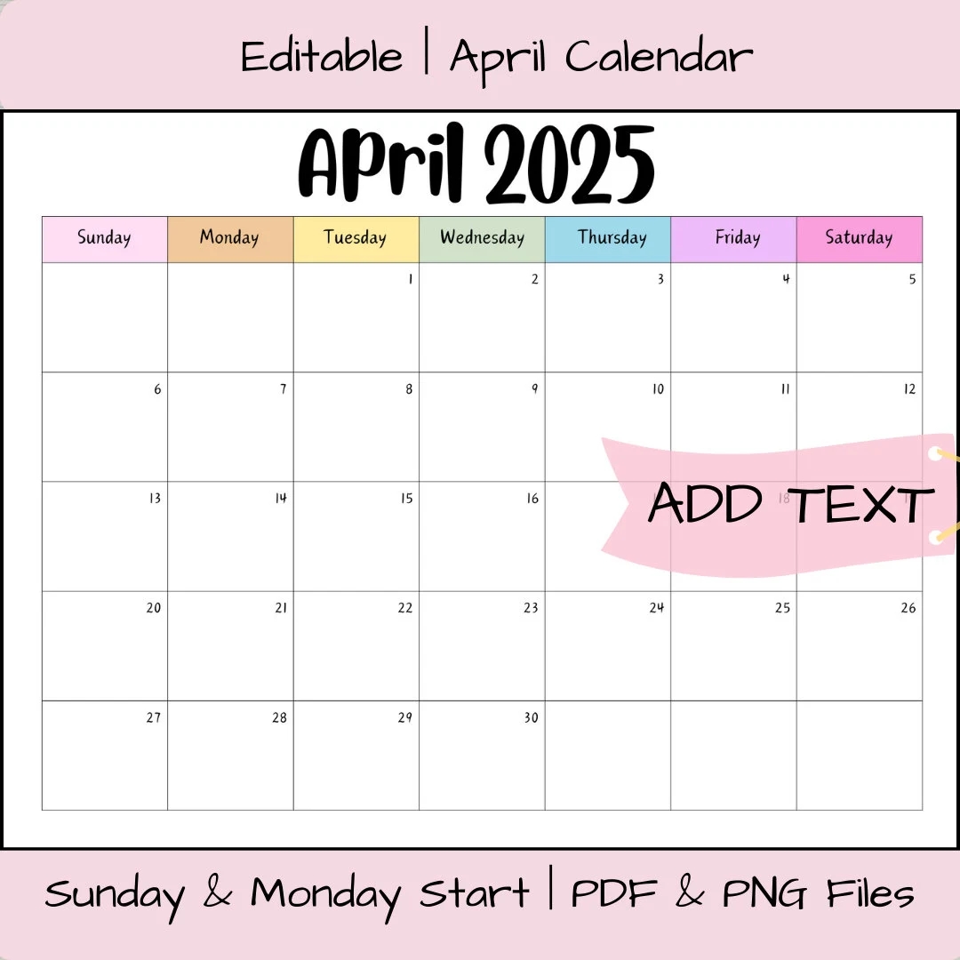Editable April 2025 Calendar Fillable Printable Activity Planner Classroom Schedule Digital Download PDF Spring Rainbow PNG Template Etsy