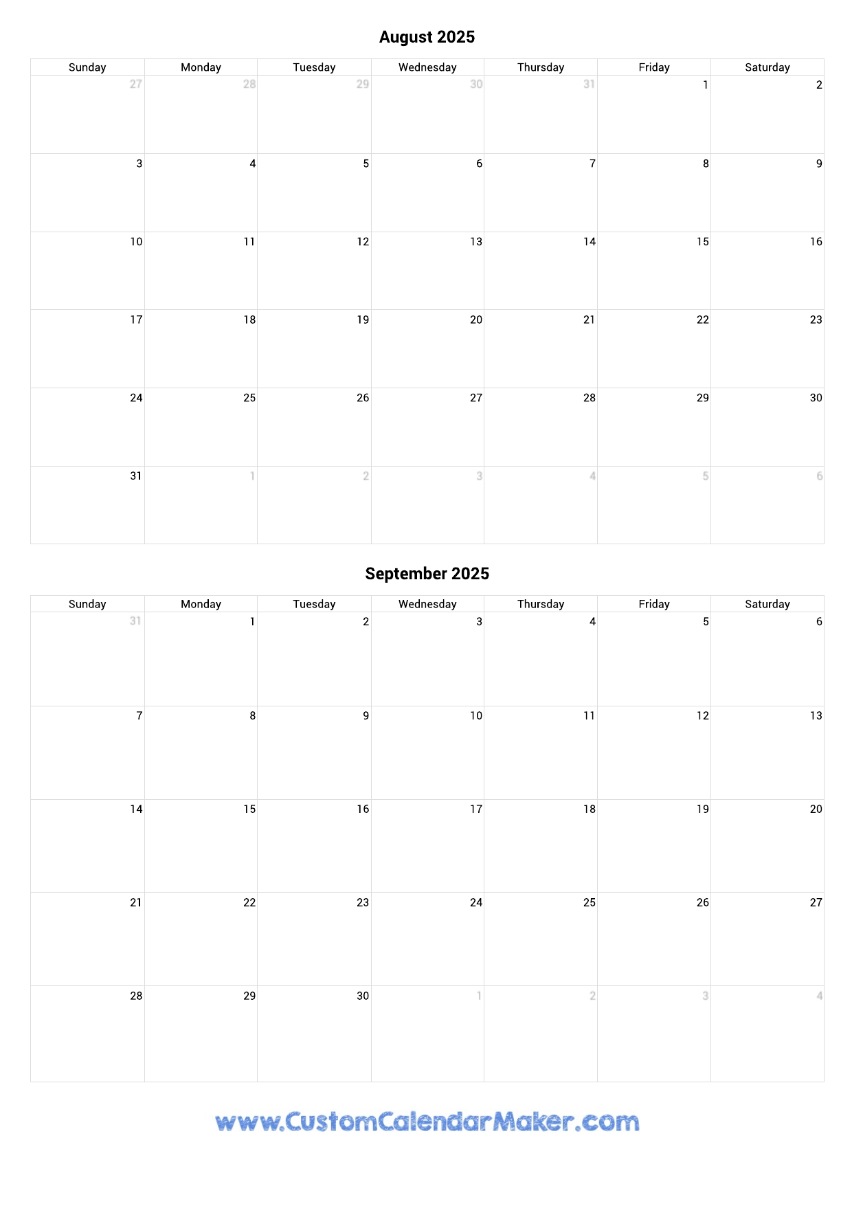 Print out multiple copies of the blank calendar for August and September 2025 and keep them in different locations, such as your home, office, or car. This way, you’ll never be without your schedule, no matter where you are.