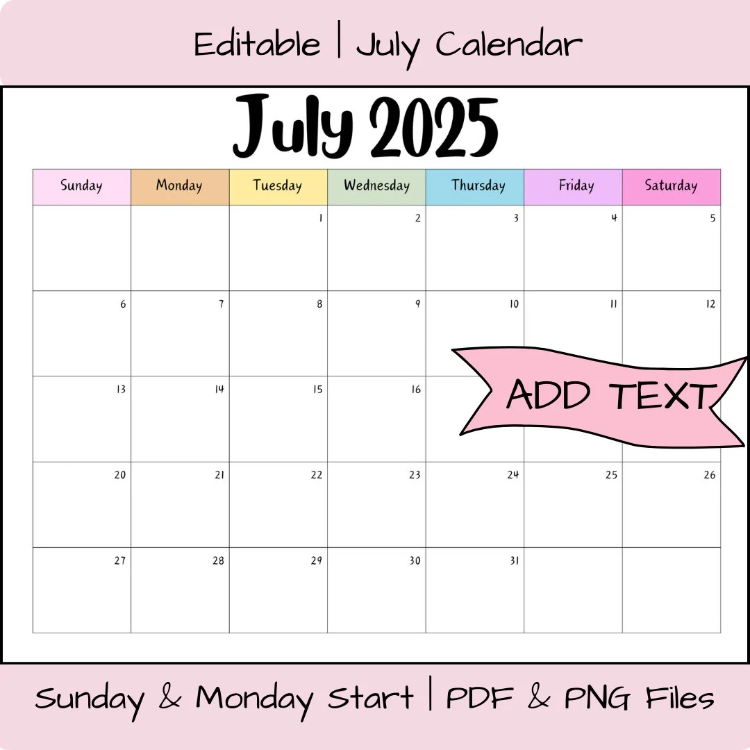 Editable July 2025 Calendar Printable Activity Planner Rainbow Classroom Calendar Digital Download PDF Files Family Organizer Fillable Etsy