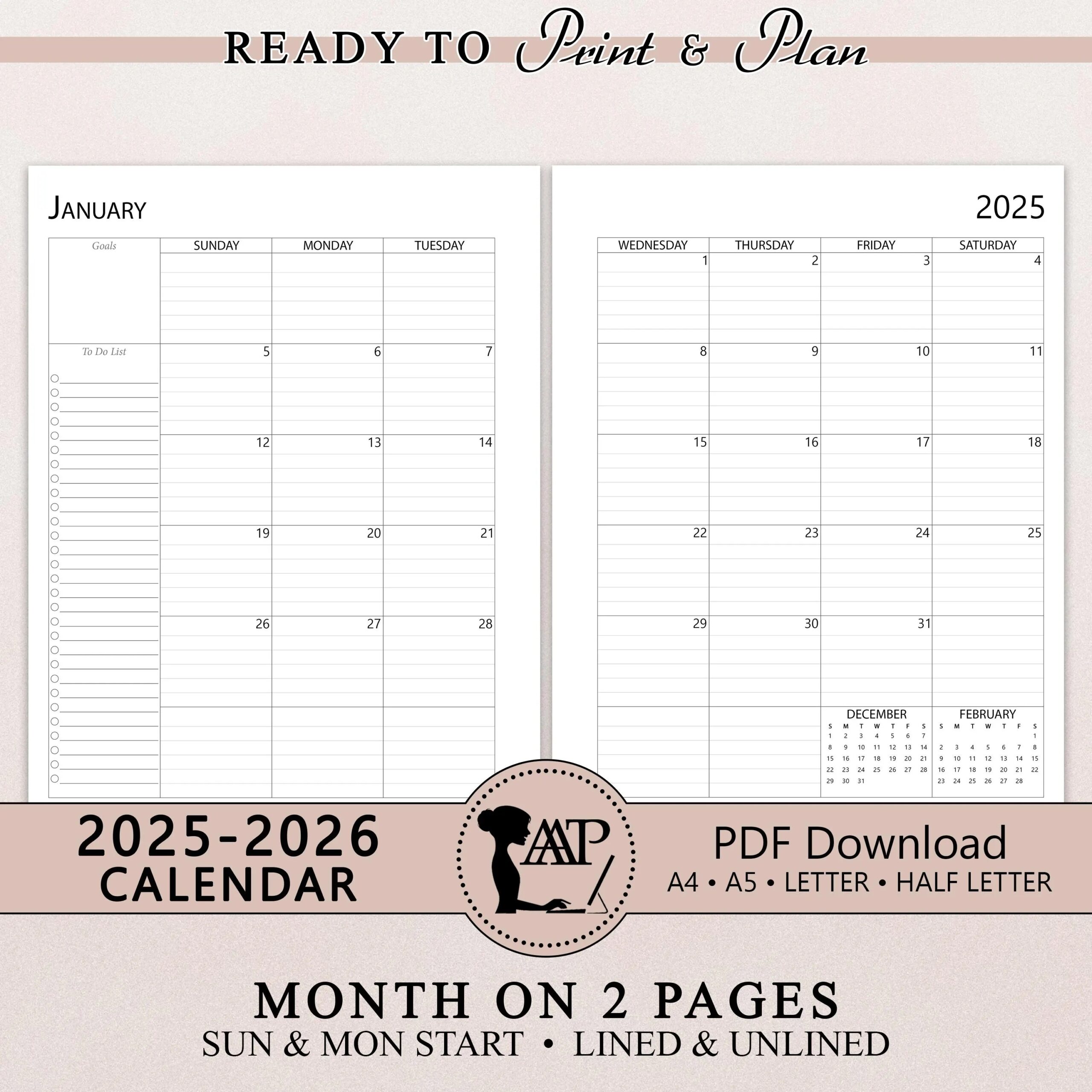 2025 2026 Monthly Calendar Printable Two 2 Page Lined Unlined Planner Insert Sunday Monday Start A4 A5 Letter Half Size PDF CLP01 02 Etsy