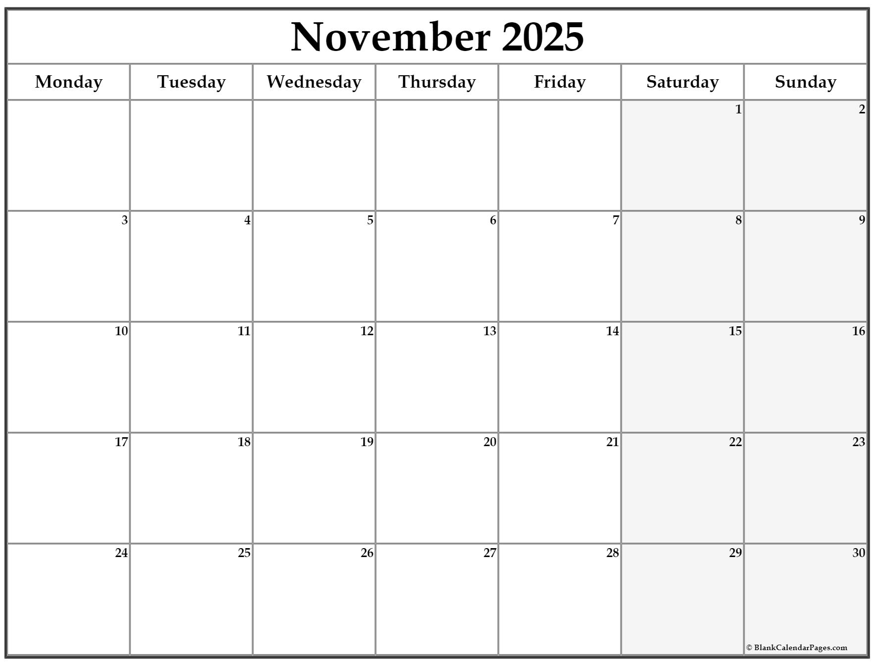 November 2025 Monday Start Calendar Monday To Sunday Custom Calendar Maker
