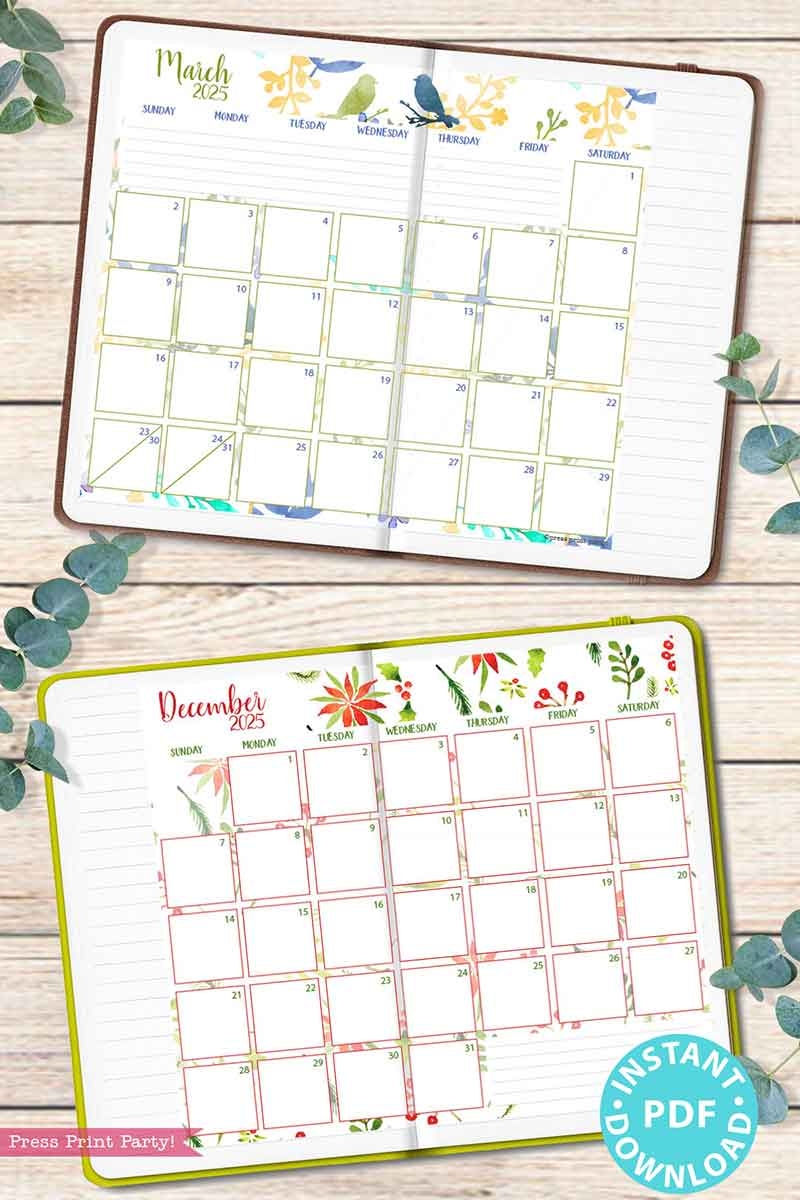 2025 Calendar Printable Set For Bullet Journals Or Binders Watercolor for Bullet Journals Or Binders