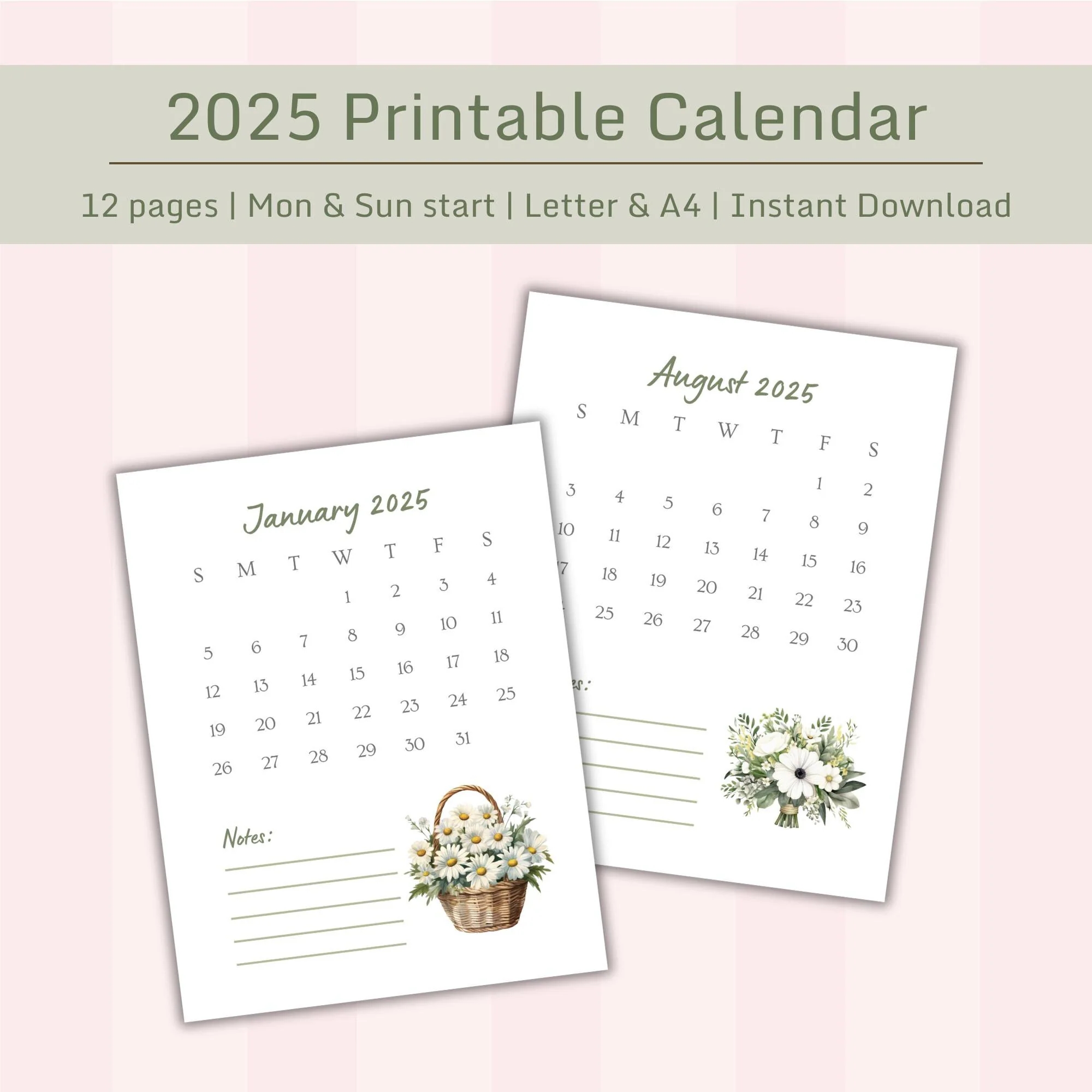 2025 Printable Calendar Daisy Theme Monthly Printable Calendar Instant Download Monday And Sunday Start US Letter A4 PRINTABLE PDF Etsy