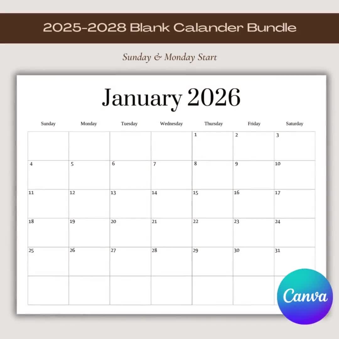 2025 2028 Blank Calendar Bundle Monday Start Calendar Sunday Start Calendar Printable Blank Calendar Blank Calendar Template Etsy