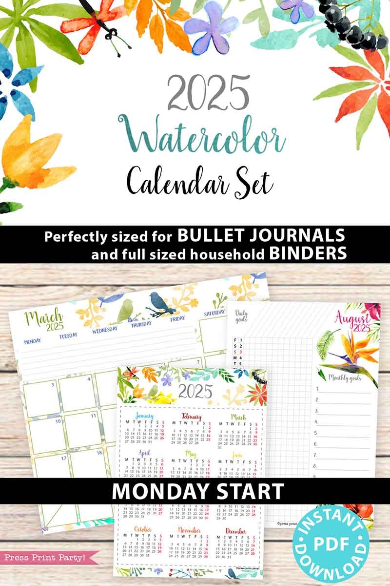 Monday Start 2025 Calendar Printable Set For Bullet Journals Or Binders Watercolor for Bullet Journals Or Binders
