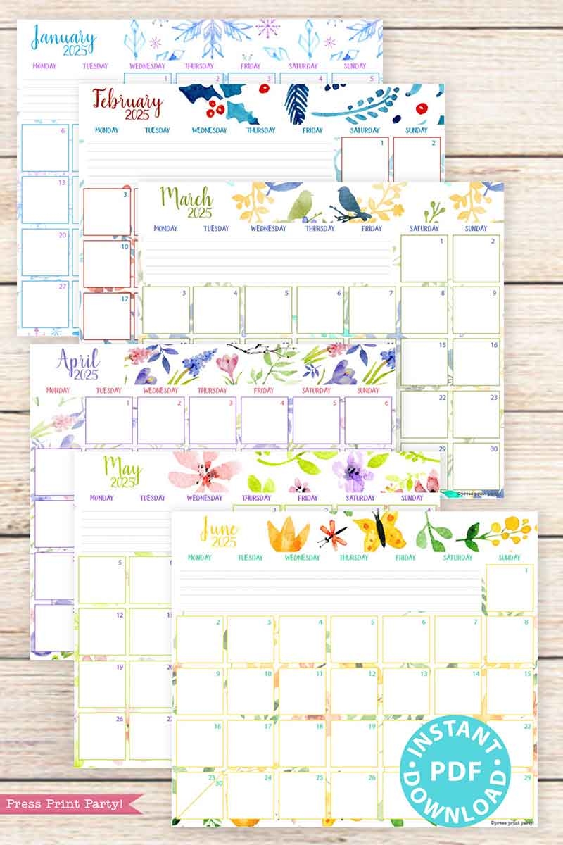 Monday Start 2025 Monthly Calendars For Bullet Journals Or Binders Watercolor Printable