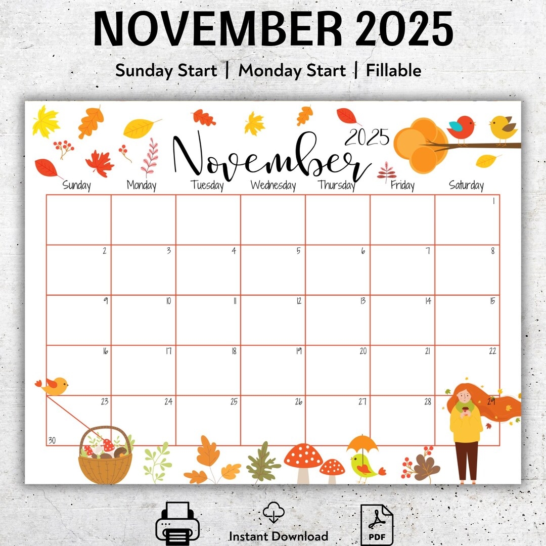 EDITABLE November 2025 Calendar Fall Foliage Calendar For Women Printable Planner Fillable Monthly Schedule Homeschool Calendar PDF Etsy