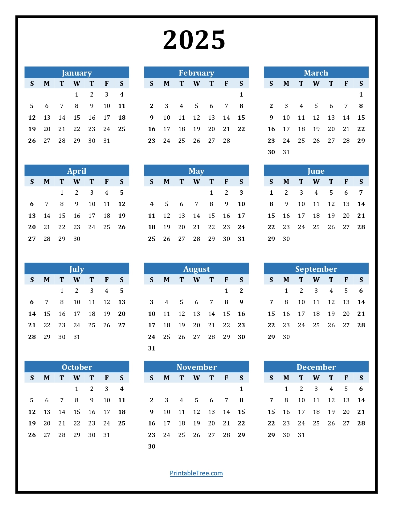 Printable Calendar 2025 One Page With Holidays Single Page 2025 Yearly Blank PDF Templates