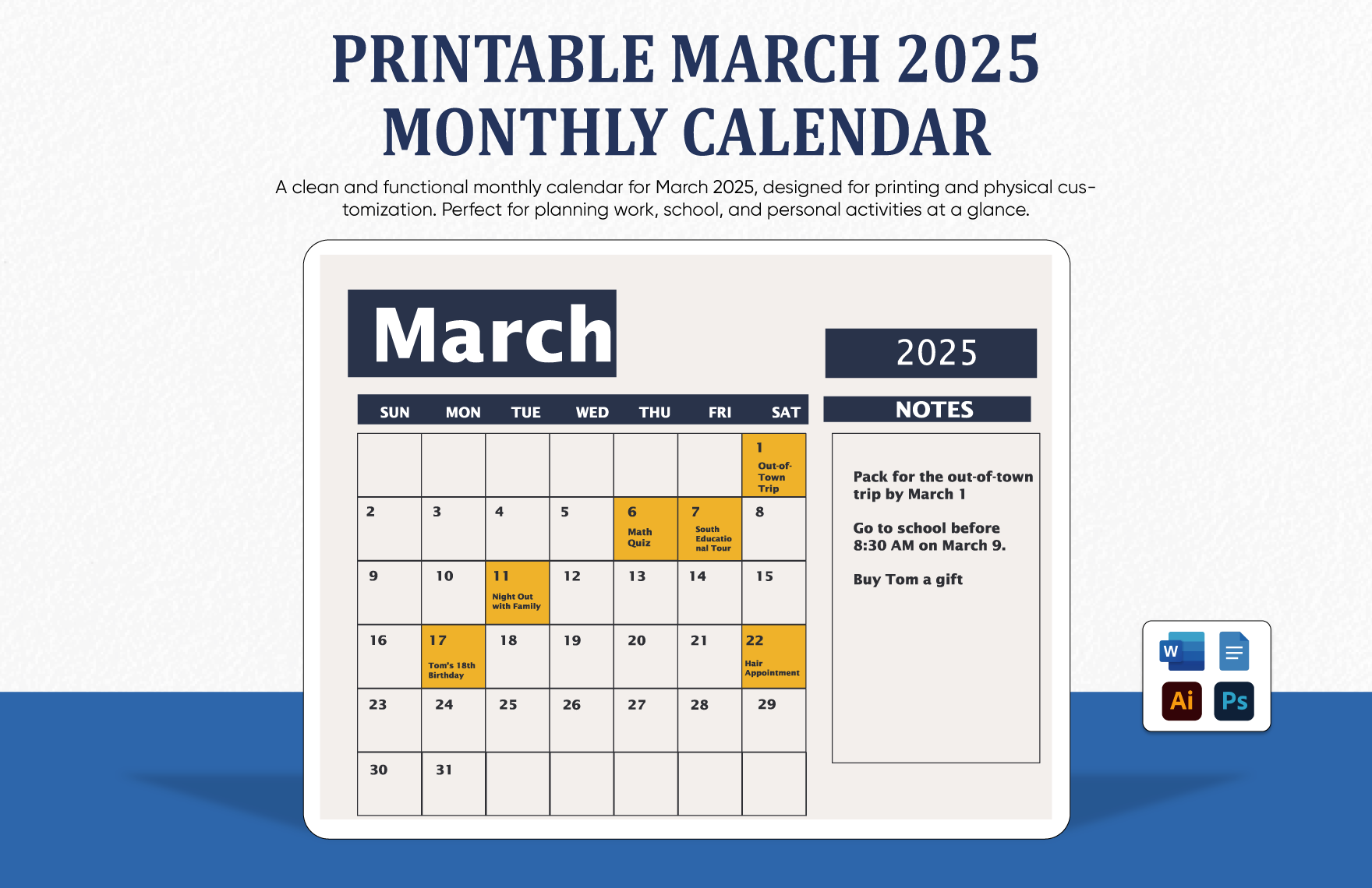 Printable March 2025 Monthly Calendar Template In Illustrator Word Google Docs PSD To Download Template