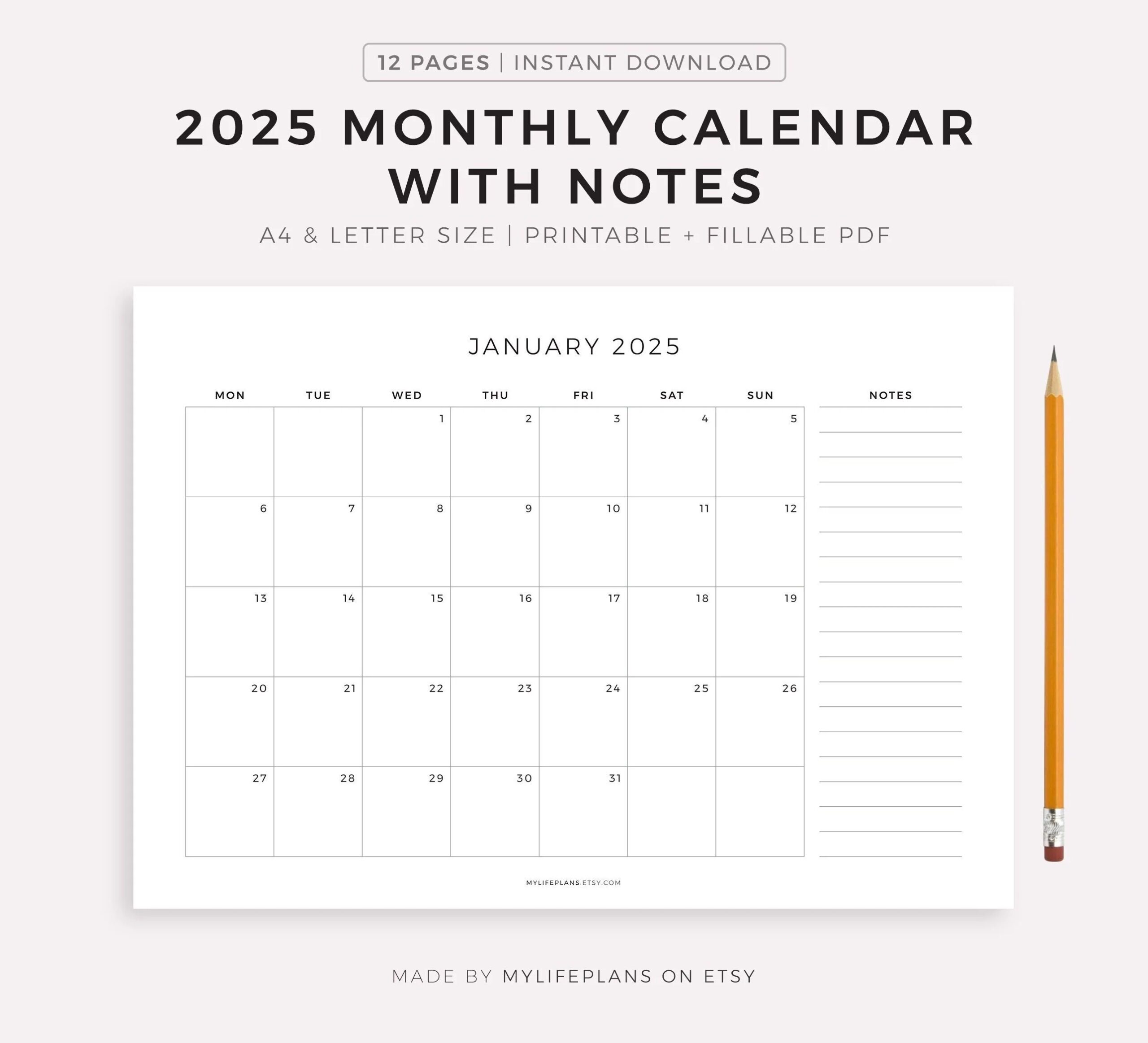 2025 Monthly Calendar With Notes Landscape Printable Calendar Template Minimalist Calendar Year Calendar Monday sunday Start A4 letter Etsy