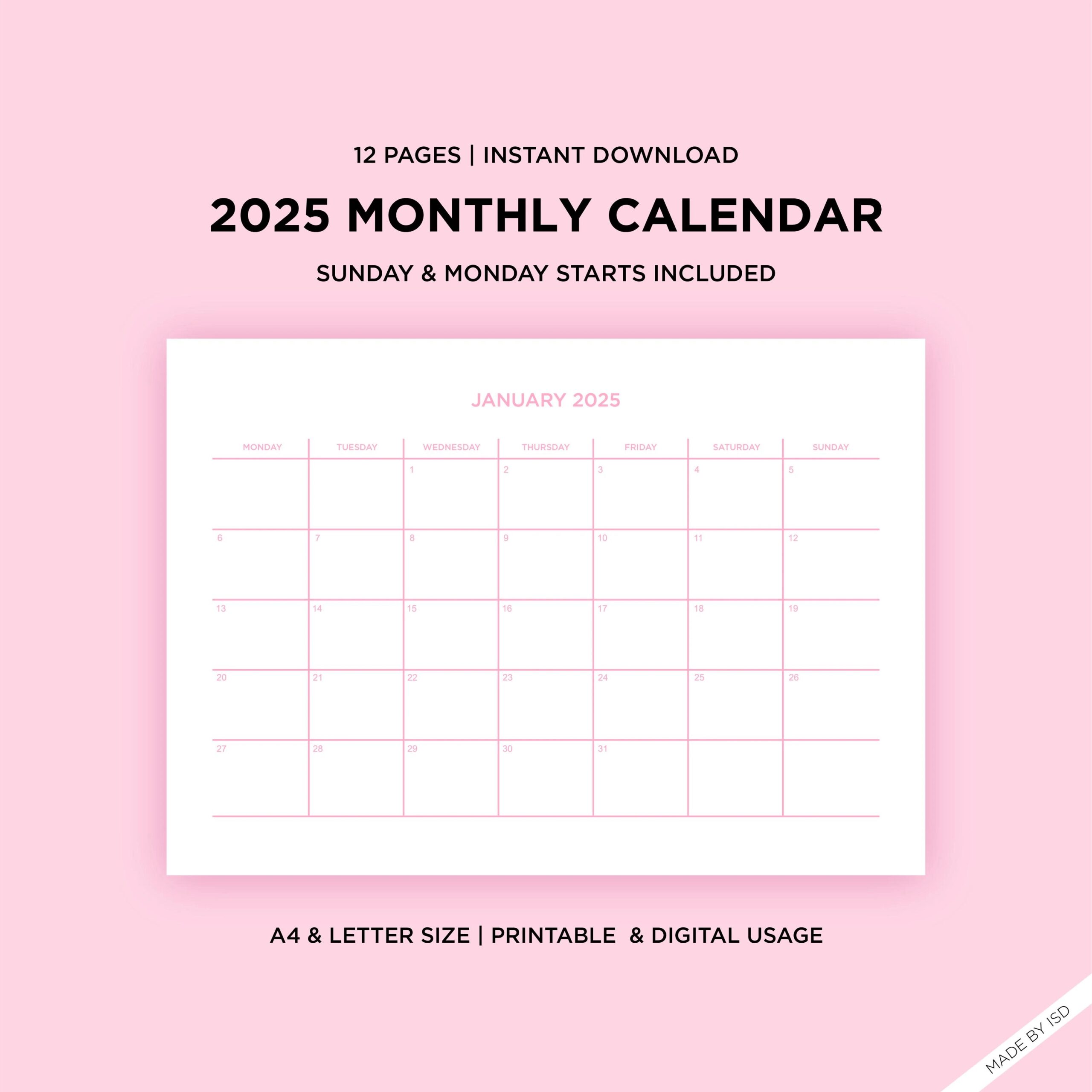 2025 Pink Monthly Calendar Template Printable Instant Digital Download Sunday Monday Start A4 letter Size Minimalist Planner Etsy