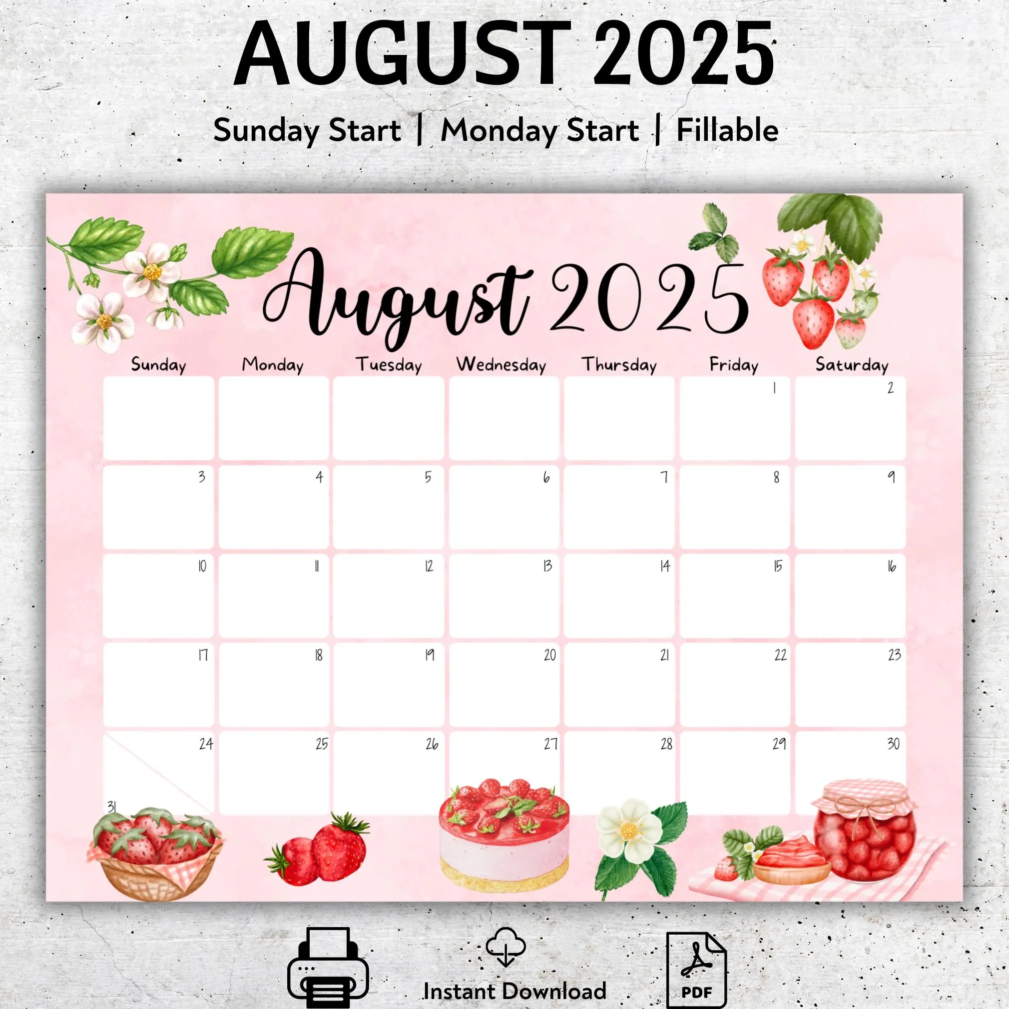 EDITABLE August 2025 Calendar Beautiful Summer Delicious Strawberries Printable Vacation Planner Simple Organizer Instant Download Etsy