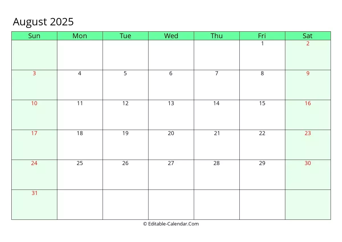 Editable Calendar August 2025 In Excel Word PDF