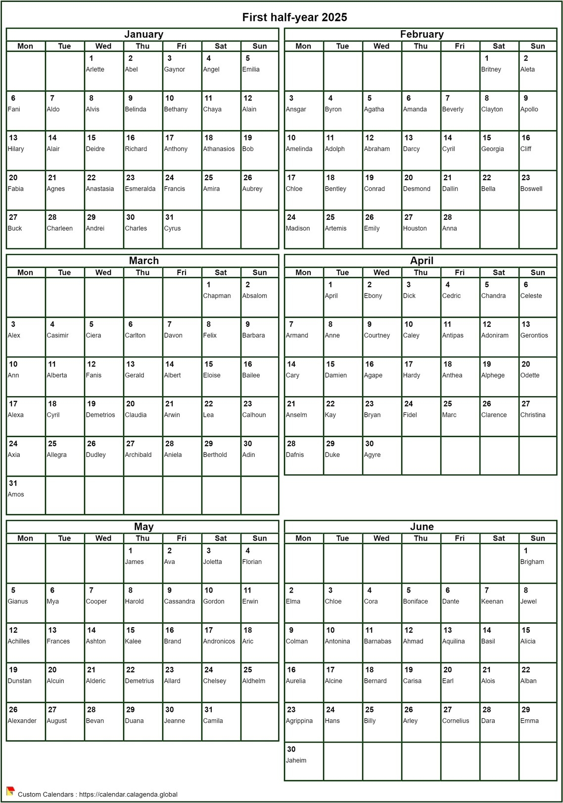 Calendar 2025 To Print Half year Format Portrait