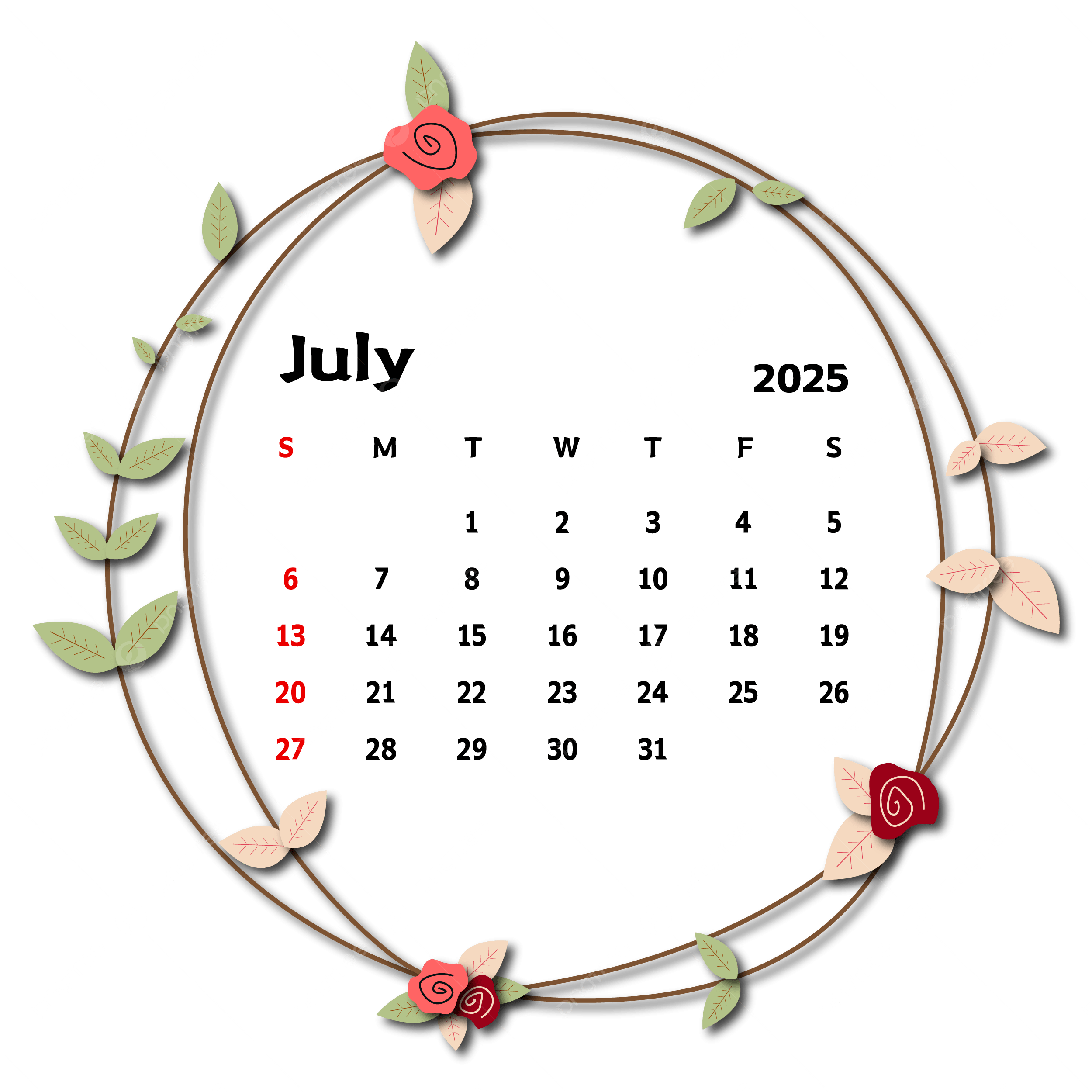 July 2025 Calendar With Leafy Circle Frame Vector Calendar July 2025 Leaf PNG And Vector With Transparent Background For Free Download