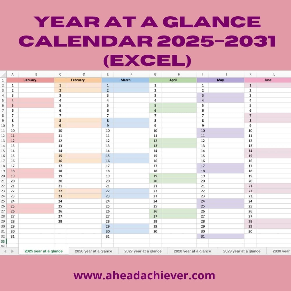 Year At A Glance 2025 2031 Excel Ahead Achiever