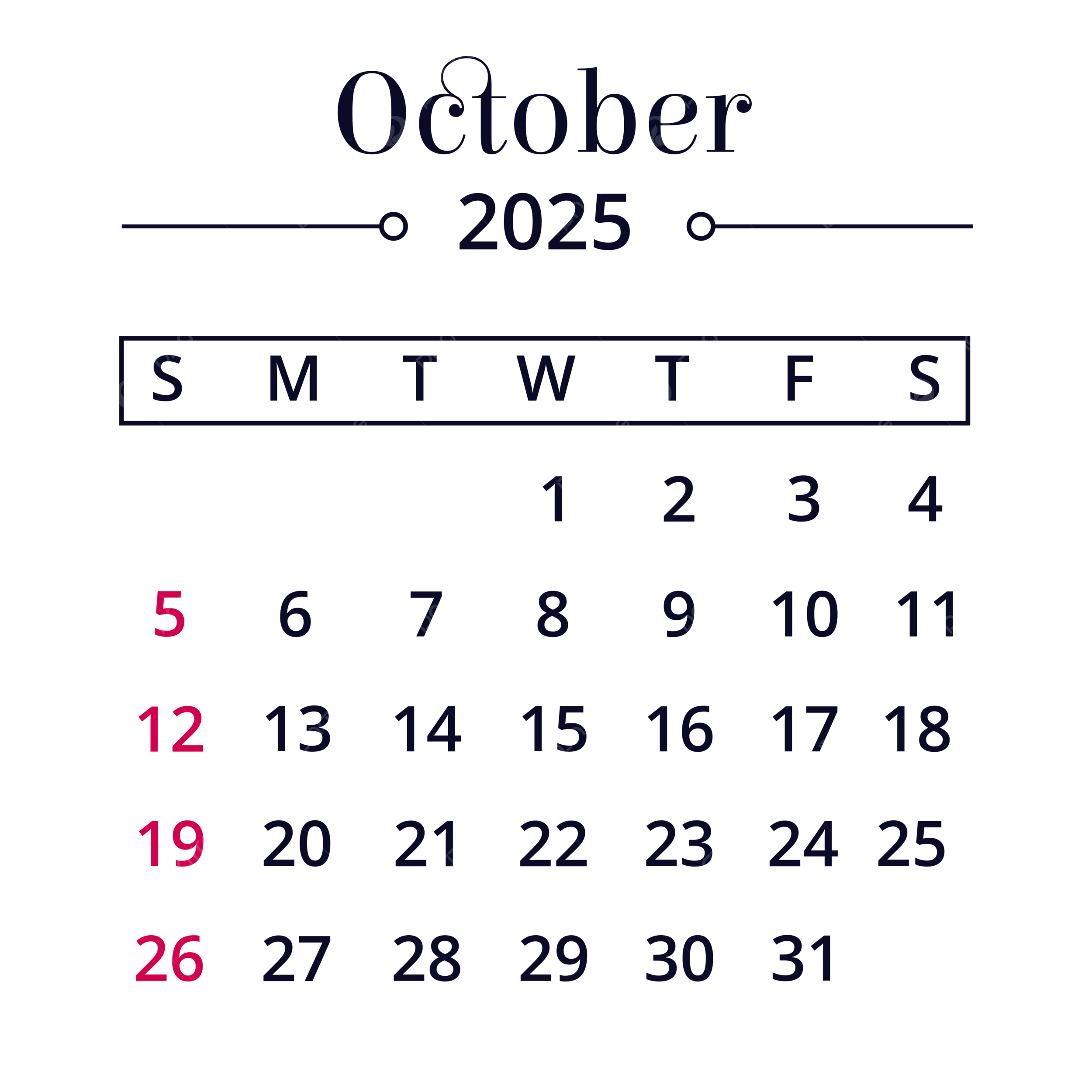 Minimalist October 2025 Calendar Vector Calendar 2025 October 2025 Calendar PNG And Vector With Transparent Background For Free Download