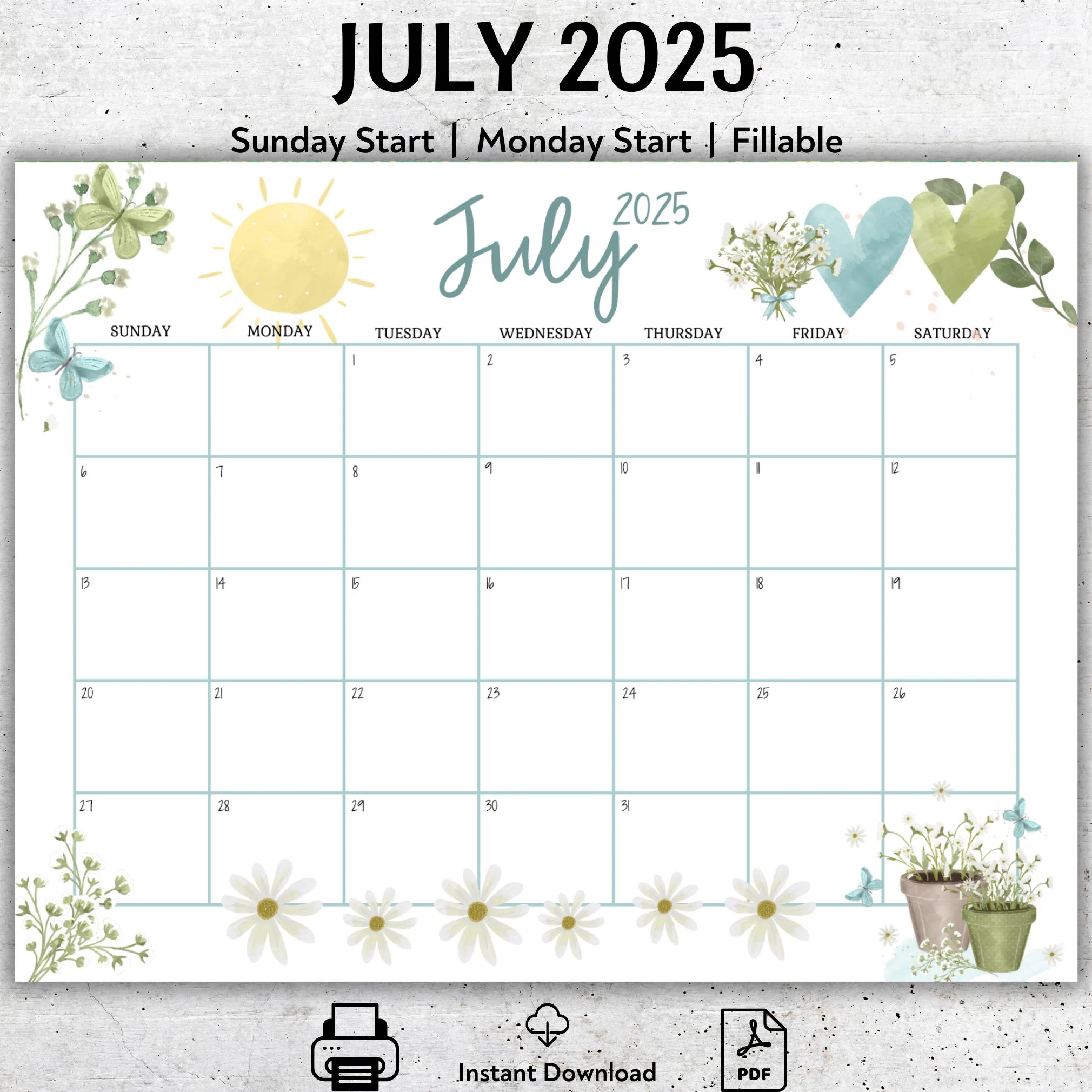 EDITABLE July 2025 Calendar Beautiful Daisies Garden Flower Butterflies Summer Printable Planner Fillable Calendar Instant Download Etsy