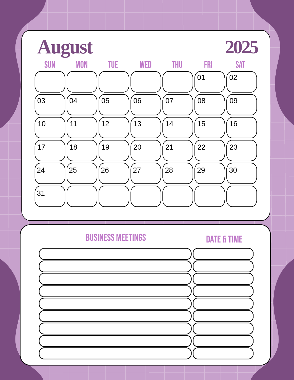 Don’t wait until the last minute to start planning your month. Download our Free Monthly Blank Calendar August 2025 today and take the first step towards a more organized and productive month. Whether you’re scheduling appointments, setting deadlines, or planning events, our calendar is the perfect tool to help you stay on track and make the most of your time.