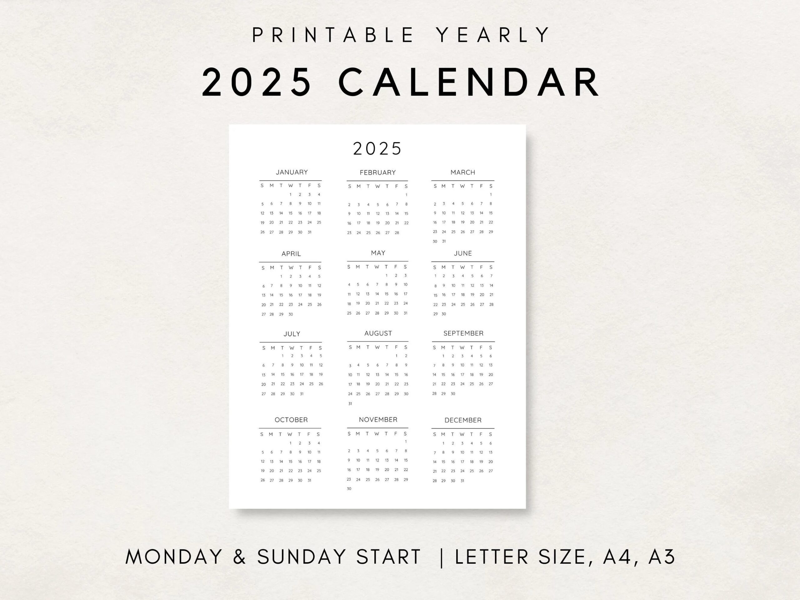 2025 Yearly Calendar Printable Calendar 2025 Calendar 2025 Digital Calendar Yearly Wall Calendar Year At A Glance 2025 Annual Calendar Etsy