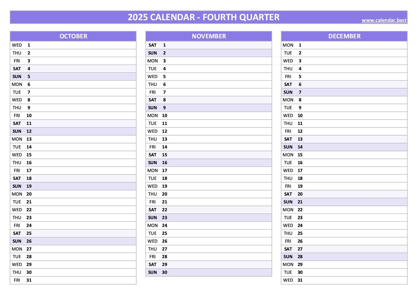 Printable 4th Quarter 2025 Calendar Months Of October November And December 2025