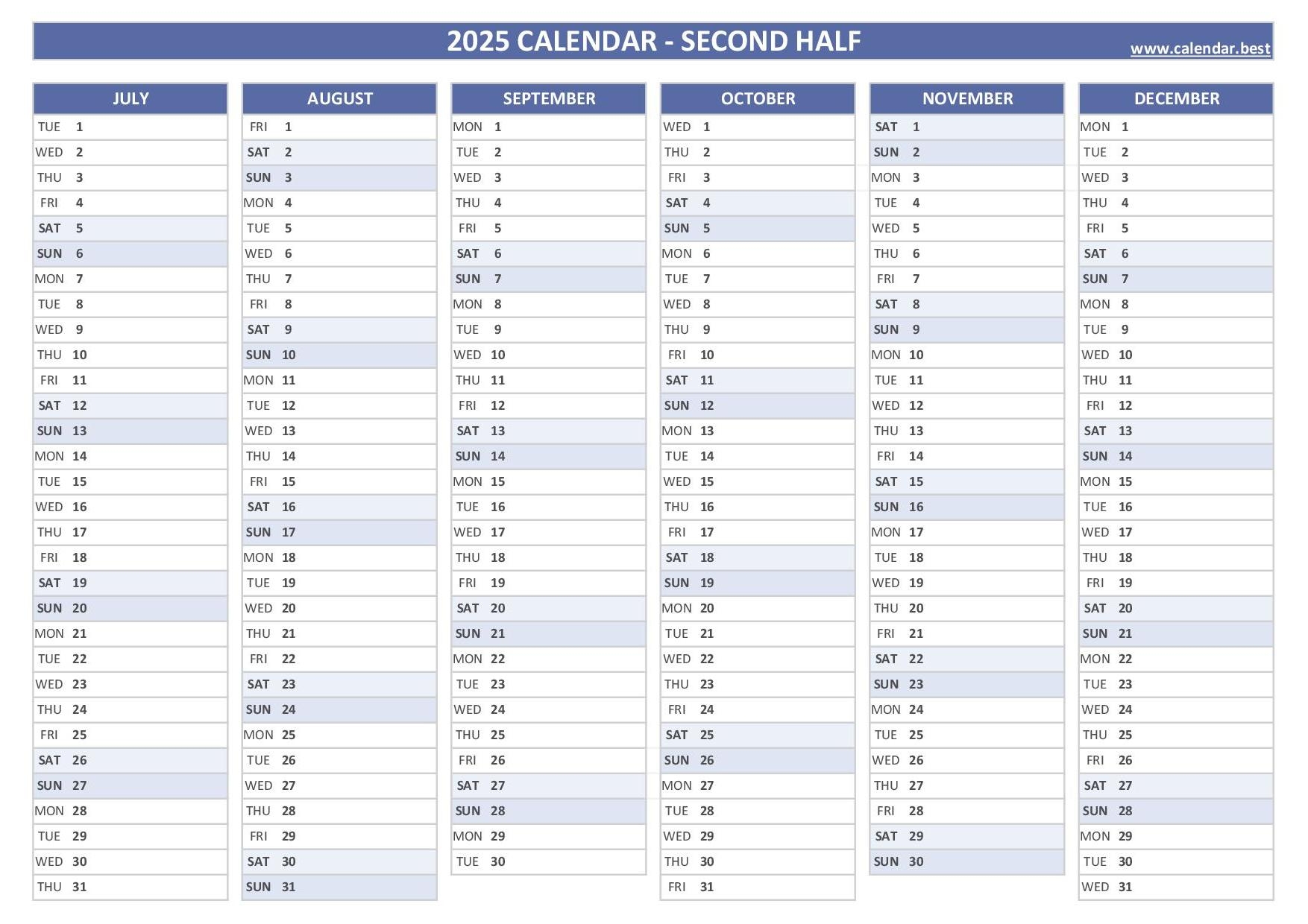 2025 Half Year Calendar To Print