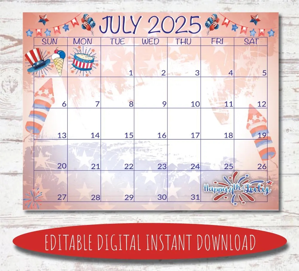 Printable Fourth Of July 2025 Calendar Editable Summer Calendar With American Flag Monthly Calendar Fillable Calendar July Planner Etsy